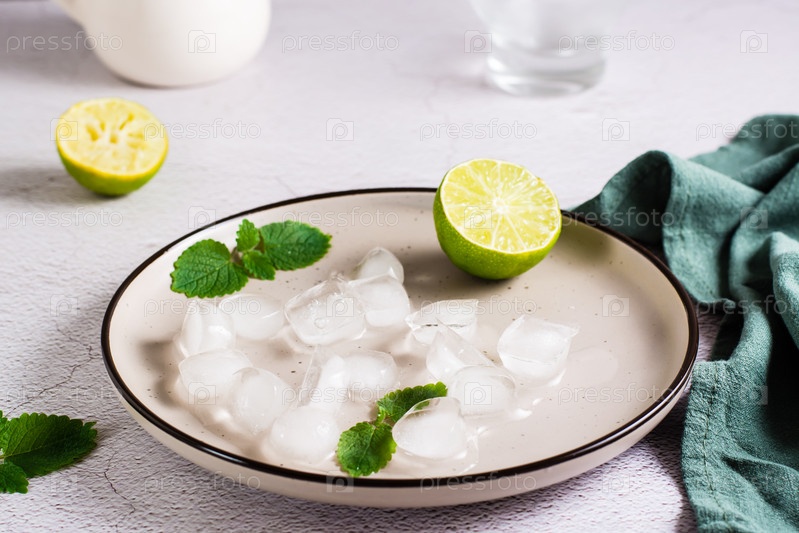 Растаявшие кубики льда, лайм и листья мяты на тарелке на столе. Коктейли домашнего приготовления