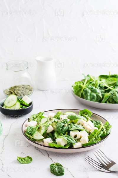 Свежий салат из огурцов, шпината, сыра и тыквенных семечек в тарелке. Вертикальный вид. Копировать пространство