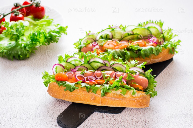 Готовы съесть хот-доги с колбасой, огурцом, помидором и зеленью на доске на столе. Фаст-фуд для перекуса