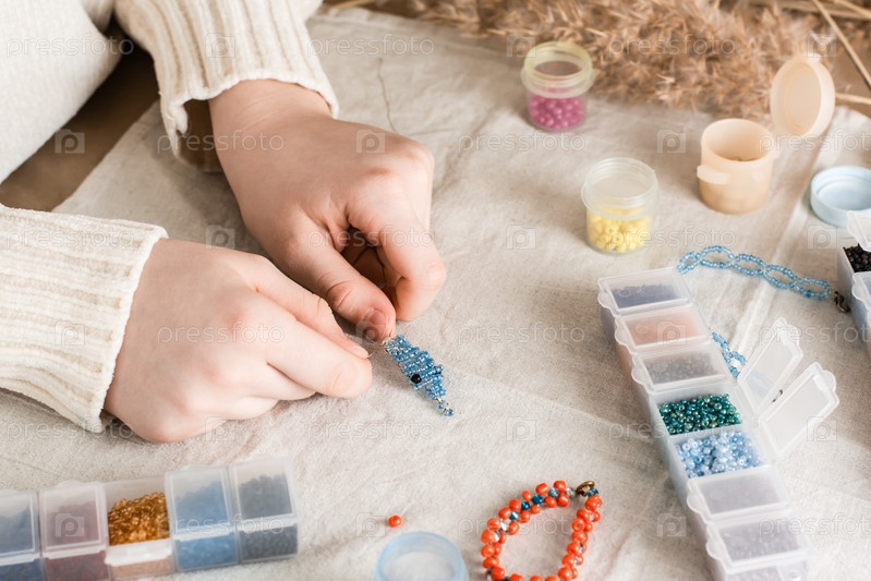 Руки девушки плетут дельфина на столе с предметами для бисероплетения. Развитие творческих способностей и мелкой моторики у детей. Вид сверху