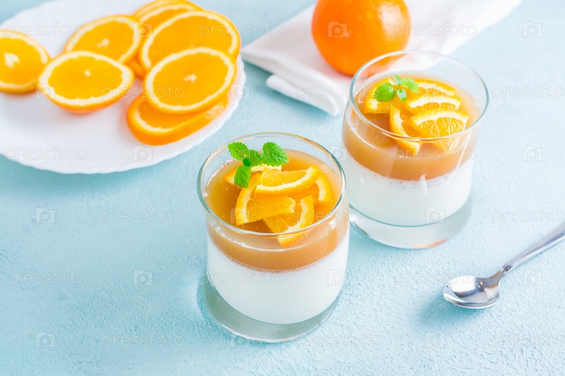 Апельсиновая панакота с листом мяты в стаканах и дольками апельсина на тарелке на светлом столе. Сладкий итальянский десерт
