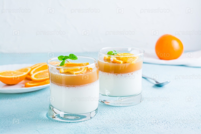 Панна-котта с апельсиновым и мятным листом в очках на светлом столе. Сладкий итальянский десерт
