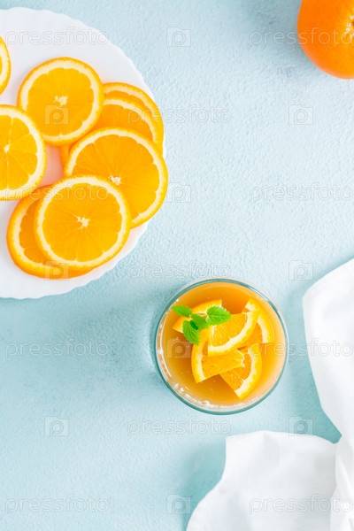Апельсиновая панакота с листом мяты в стаканах и дольками апельсина на тарелке на светлом столе. Сладкий итальянский десерт. Верхний и вертикальный вид