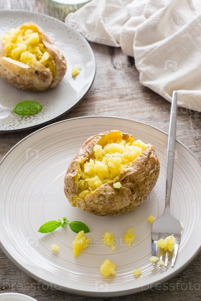 Печеный картофель в кожуре на тарелках на деревянном столе. Вегетарианская натуральная пища. Вертикальный вид