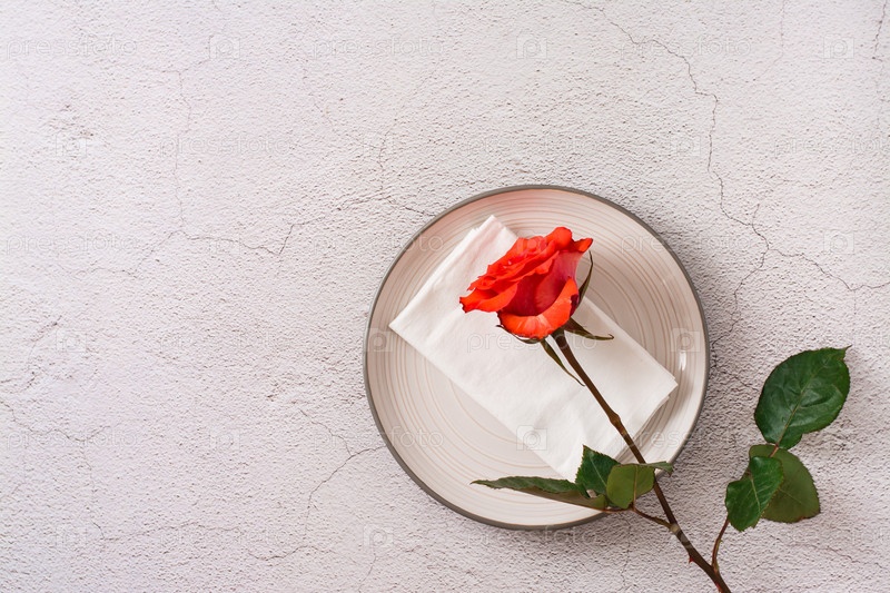 Свежая красная роза и салфетка на тарелке на текстурированном сером фоне. Эко праздничная сервировка. Вид сверху