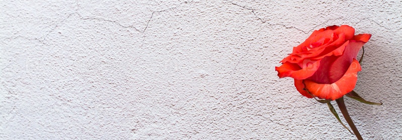 Бутон свежей красной розы на сером фоне текстуры. Вид сверху. Веб-баннер