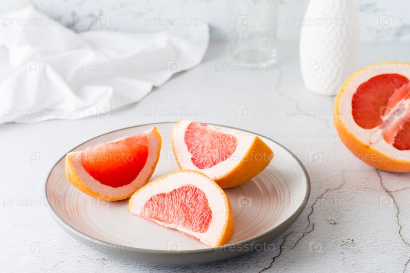 Кусочки сочного свежего грейпфрута на тарелке на светлом столе. Витаминное диетическое питание