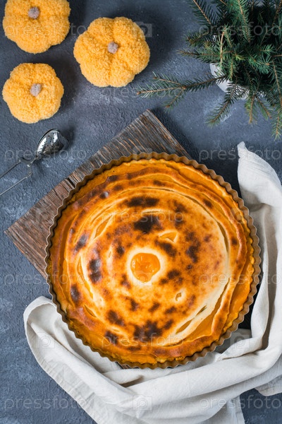 Готовый к употреблению свежий сладкий многослойный тыквенный пирог в форме на столе. Угощение на День Благодарения. Верхний и вертикальный вид