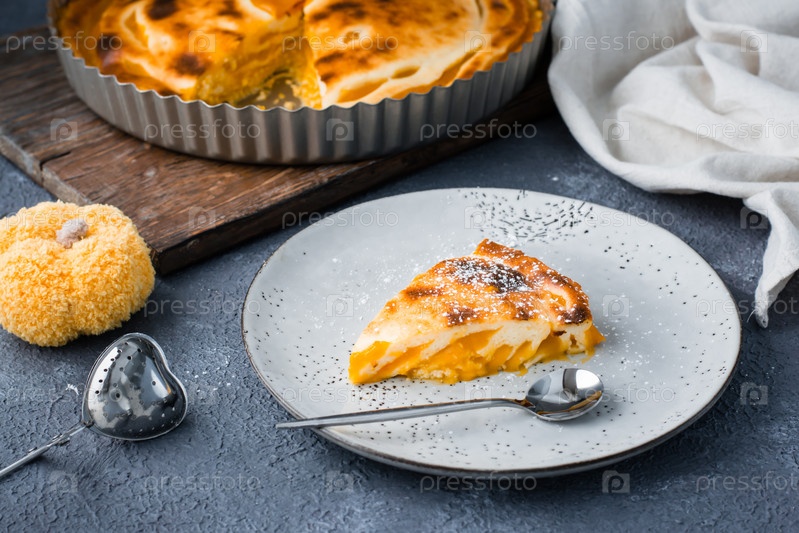 Аппетитный кусочек свежего сладкого слоеного тыквенного пирога в сахарной пудре на тарелке на столе. День благодарения