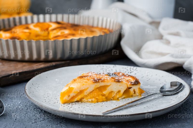 Аппетитный кусочек свежего сладкого слоеного тыквенного пирога в сахарной пудре на тарелке на столе. Угощение на День Благодарения. Крупный план