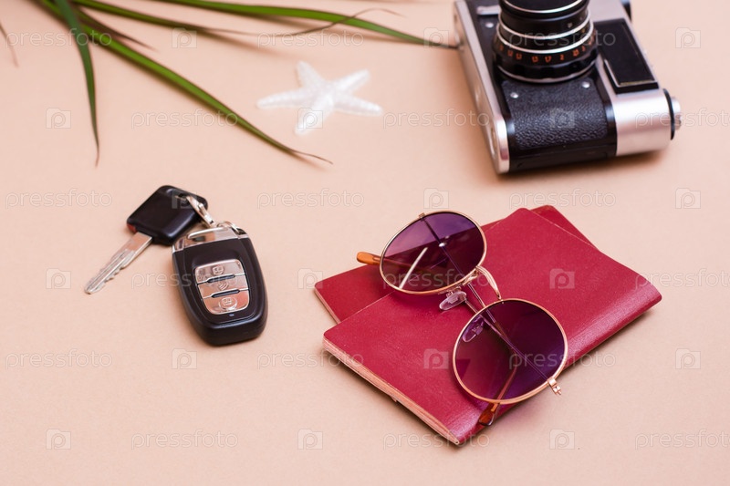 Яркая дорожная квартира лежала с солнцезащитными очками, паспортами, винтажной камерой и ключами от машины на бежевом фоне. Автомобильное путешествие