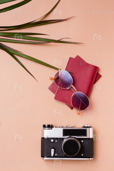 Яркая дорожная квартира лежала с солнцезащитными очками, паспортами и винтажной камерой на бежевом фоне. Автомобильное путешествие. Вертикальный вид