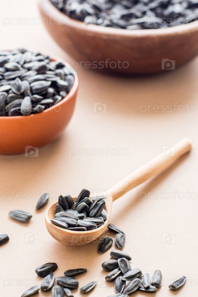 Сырые неочищенные семечки в деревянной ложке и миски с семенами на столе. Природный источник витаминов и жиров. Вертикальный вид