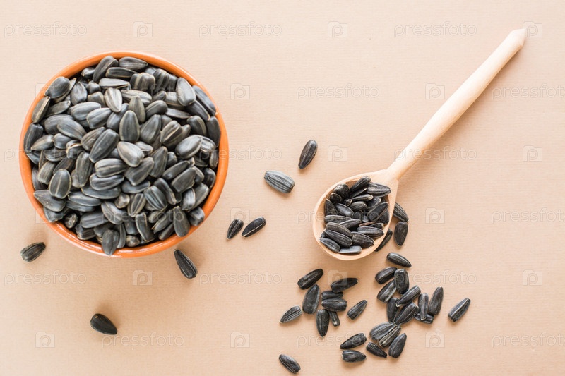 Сырые неочищенные семечки в деревянной ложке и миске с семенами на столе. Природный источник витаминов и жиров. Вид сверху