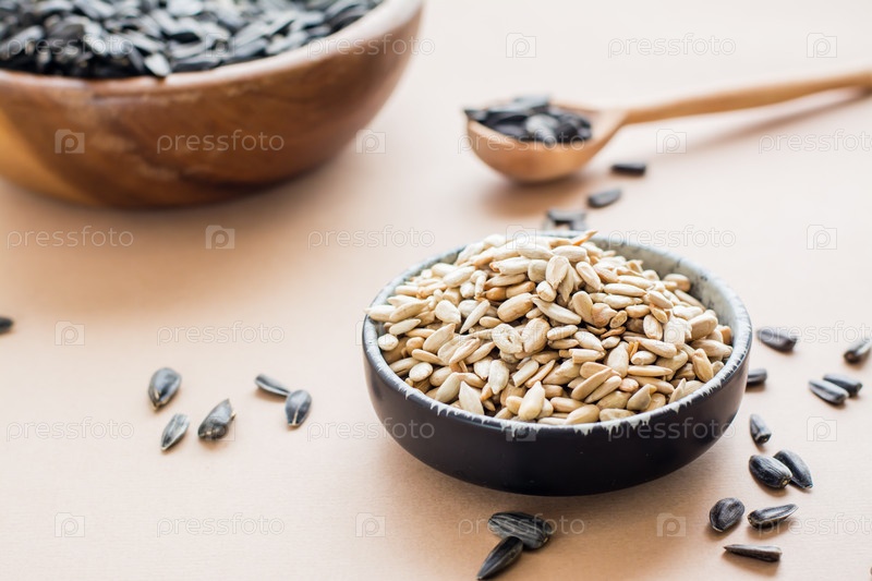 Сырые очищенные семечки в миске и тарелка с неочищенными семечками на столе. Природный источник витаминов и жиров