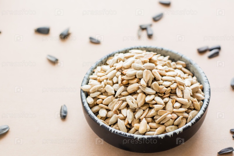 Сырые очищенные семечки подсолнуха в миске на столе. Природный источник витаминов и жиров. Копировать пространство