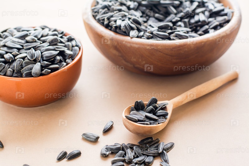 Сырые неочищенные семечки в деревянной ложке и миски с семенами на столе. Натуральный источник витаминов и жиров