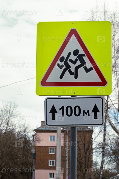 Дорожный знак, предупреждающий о наличии пешеходной зоны и необходимости ограничения скорости. Тула, Россия