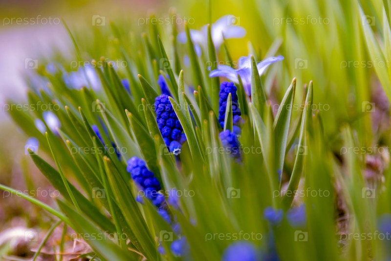 Весенний цветок гиацинты Muscari Scilla. цветник под весенним солнцем