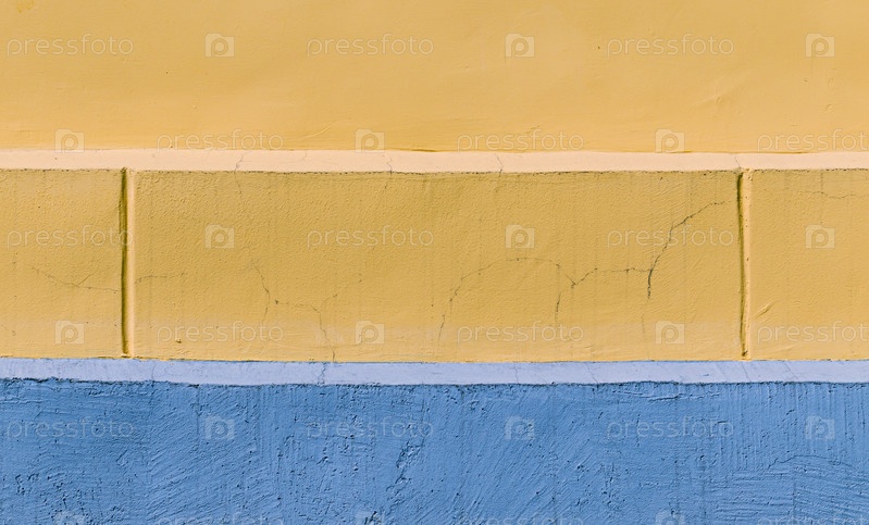 Желтая бетонная стена и синий цоколь в качестве текстуры или фона. Геометрический стиль. Оштукатуренная поверхность. крупным планом