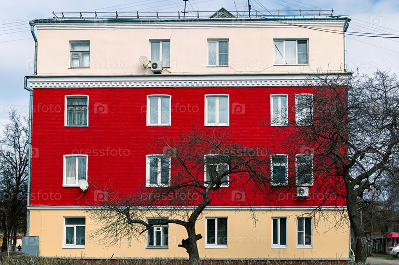 Красочный фасад жилого кирпичного дома. Апрель 2020. Тула, Россия