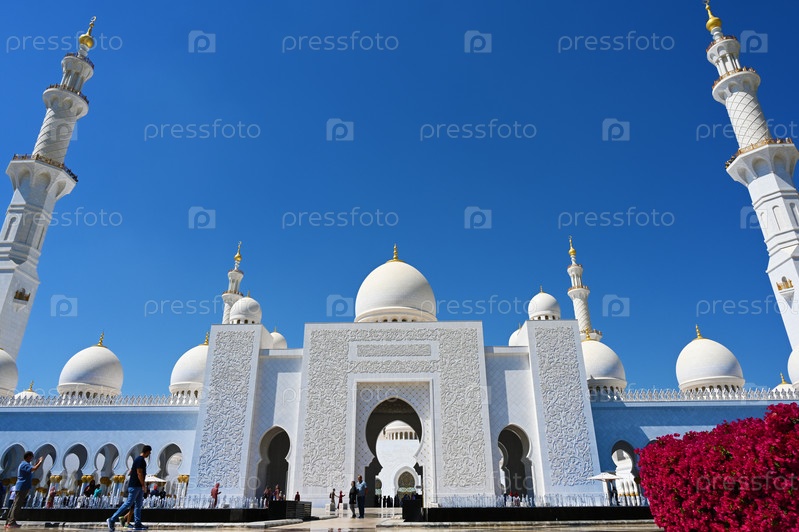 Большая мечеть шейха Заида бин Султана Аль Нахайяна, Абу-Даби, Объединенные Арабские Эмираты. Ясный солнечный день, 12 марта 2020 г