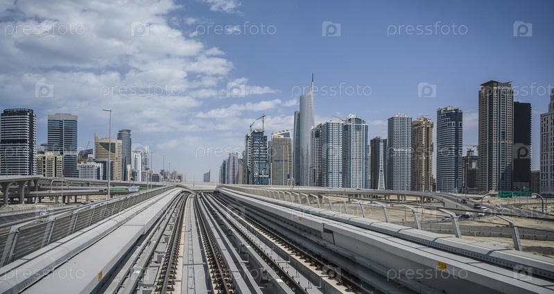 Линия метро Дубая вдоль улицы Шейха Зайда в ОАЭ. Ясный солнечный день 15 марта 2020 г