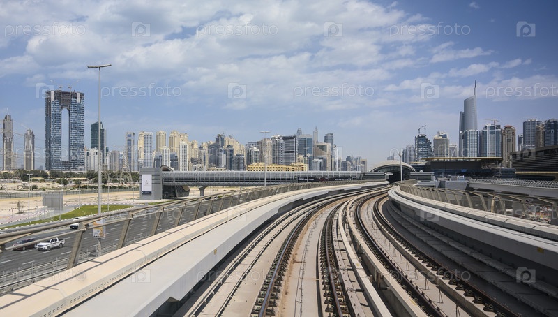 Линия метро Дубая вдоль улицы Шейха Зайда в ОАЭ. Ясный солнечный день 15 марта 2020 г