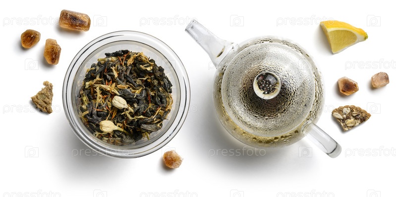 Зеленый чай с натуральными ароматическими добавками и заварочный чайник. Вид сверху на белом фоне