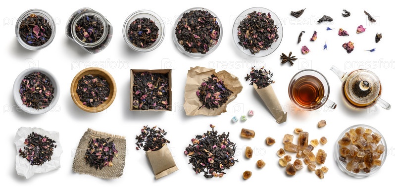 Зеленый чай и аксессуары вид сверху на белом фоне