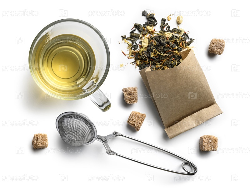 Зеленый чай с натуральными ароматическими добавками и чашка чая. Вид сверху на белом фоне