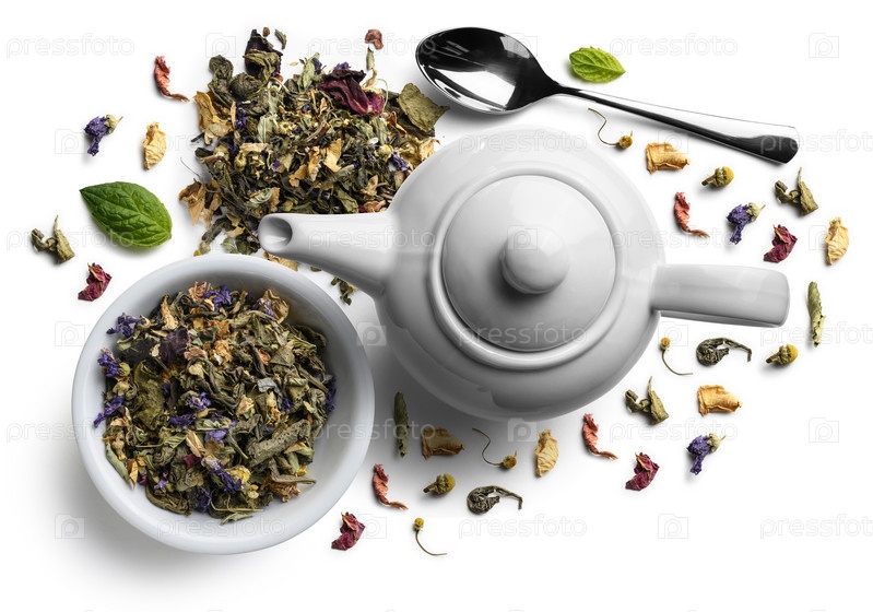 Зеленый чай с натуральными ароматизаторами и чайник. Вид сверху на белом фоне