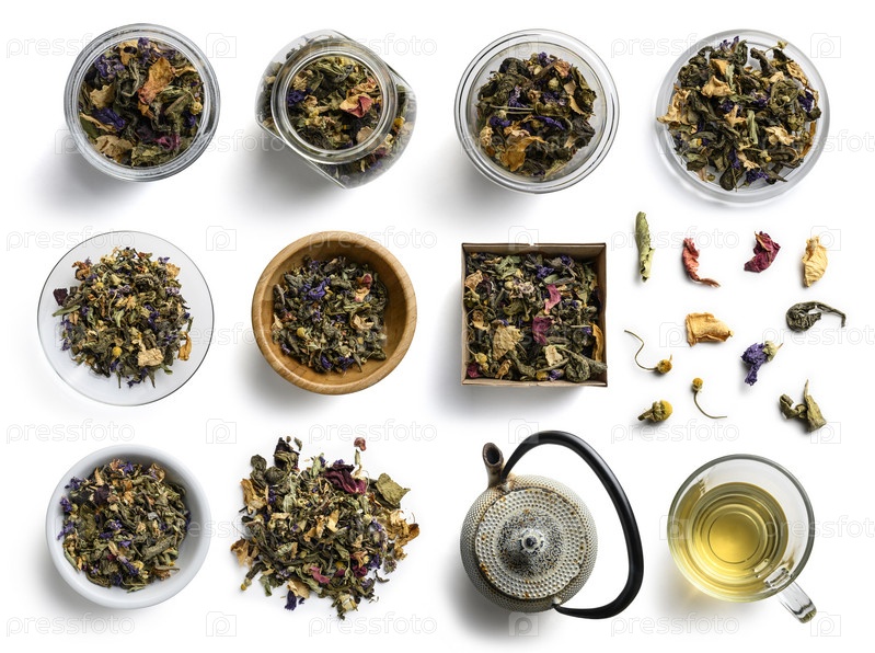 Зеленый чай и аксессуары вид сверху на белом фоне