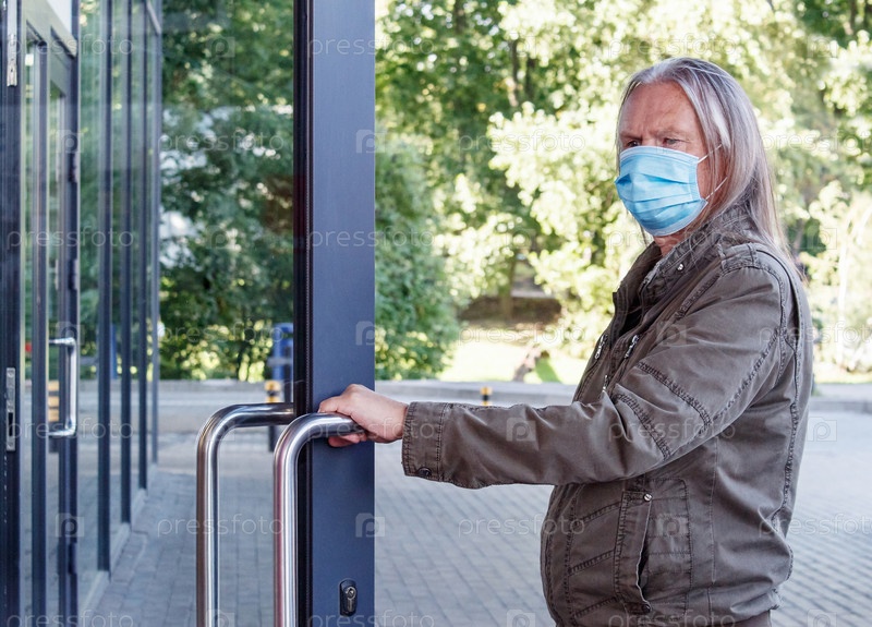 Пожилой мужчина в защитной маске открывает дверь в магазин
