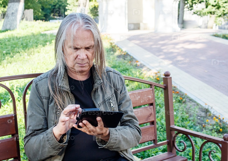 Пожилой мужчина открывает приложение на смартфоне, сидя на скамейке в городском парке