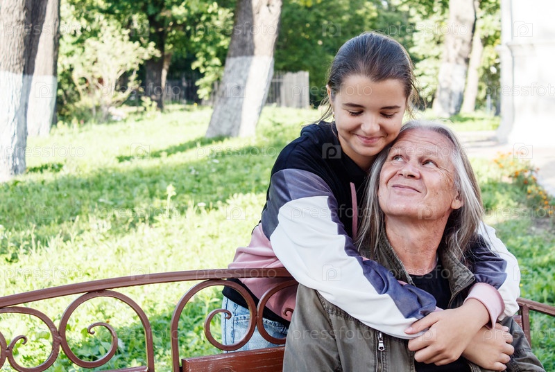Внучка обнимает дедушку на скамейке в городском парке