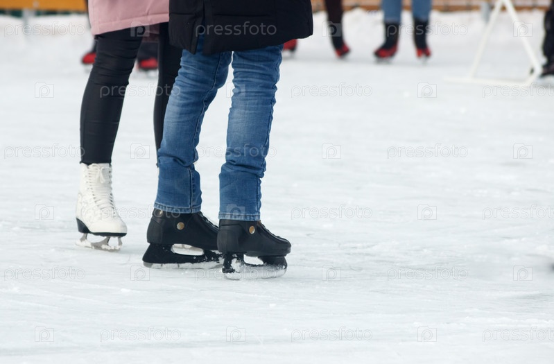 Ноги людей катаются на коньках в зимний день крупным планом