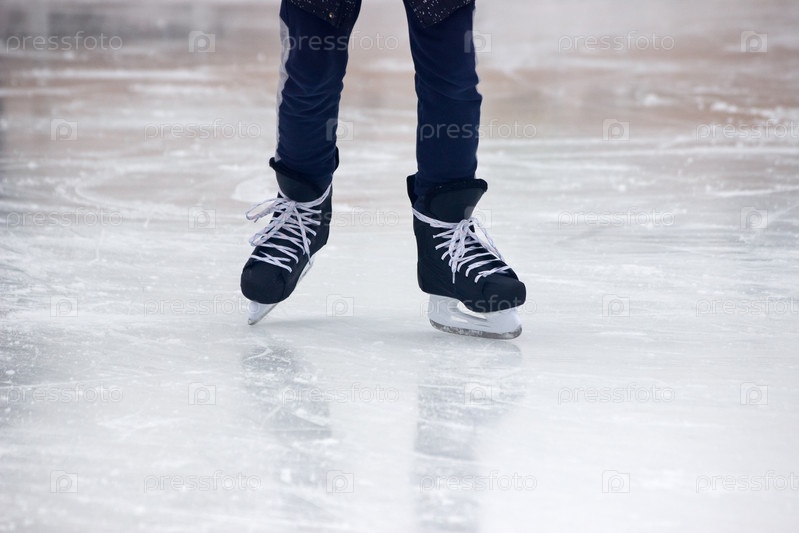 Ноги людей катаются на коньках в зимний день крупным планом