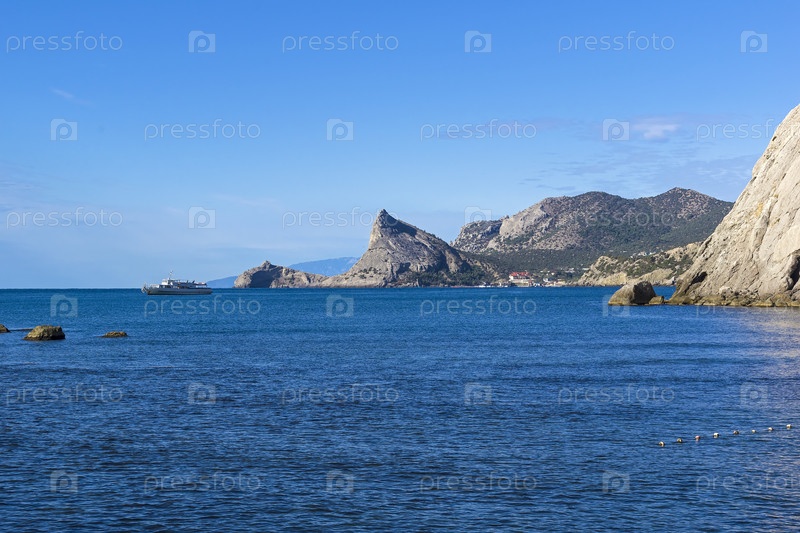 Морской пейзаж - вид из бухты курортного города Судак в сторону Нового Света. Крым, солнечный день в сентябре