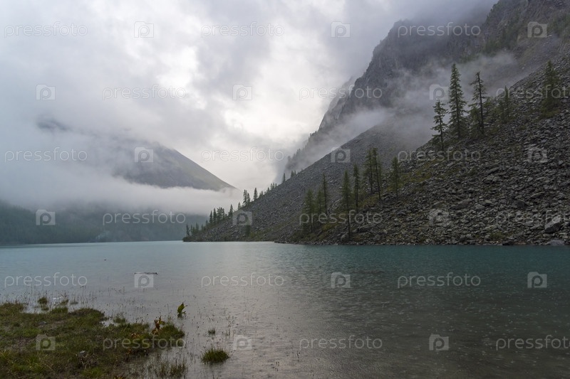 Большое (нижнее) Шавлинское озеро. Дождь, горы закрыты низкими облаками. Горный Алтай. Август