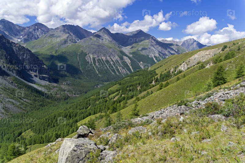 Граница между лесом и альпийскими лугами на горном склоне над Большим (Нижним) Шавлинским озером. Август, Горный Алтай