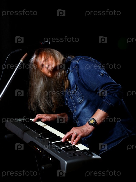 Пожилой мужчина с длинными седыми волосами в синей джинсовой рубашке играет на клавишах на сцене на черном фоне