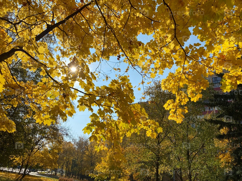 Желтые кленовые листья на дереве в сухой солнечный осенний день