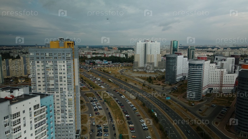 Современная городская архитектура. Многоэтажные дома с инфраструктурой. Густонаселенная городская территория. Пасмурная погода. Аэрофотосъемка