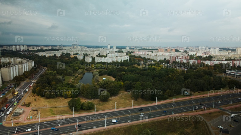 Город с высотными зданиями. Парковая зона на переднем плане. Голубое небо с облаками. Аэрофотосъемка