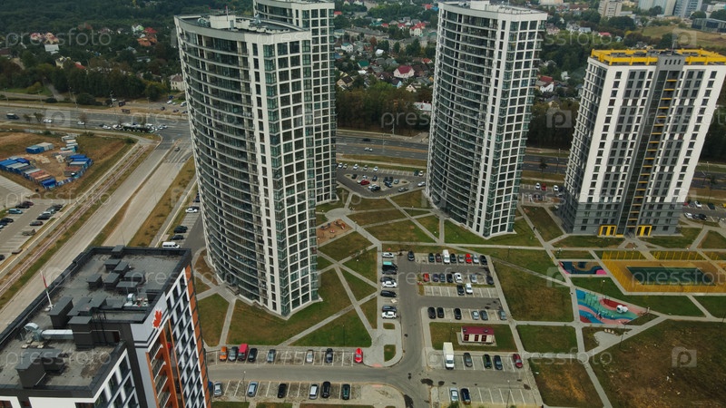 Строительная площадка нового городского квартала. Строительство многоэтажных домов. Пасмурная погода. Аэрофотосъемка