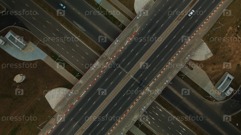 Оживленное городское шоссе. Крупная транспортная развязка. Городской ландшафт. Аэрофотосъемка