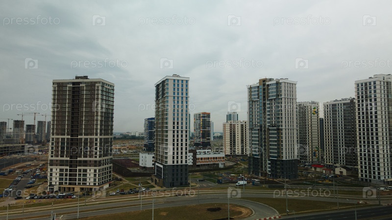 Современная городская архитектура. Многоэтажные дома с инфраструктурой. Густонаселенная городская территория. Пасмурная погода. Аэрофотосъемка