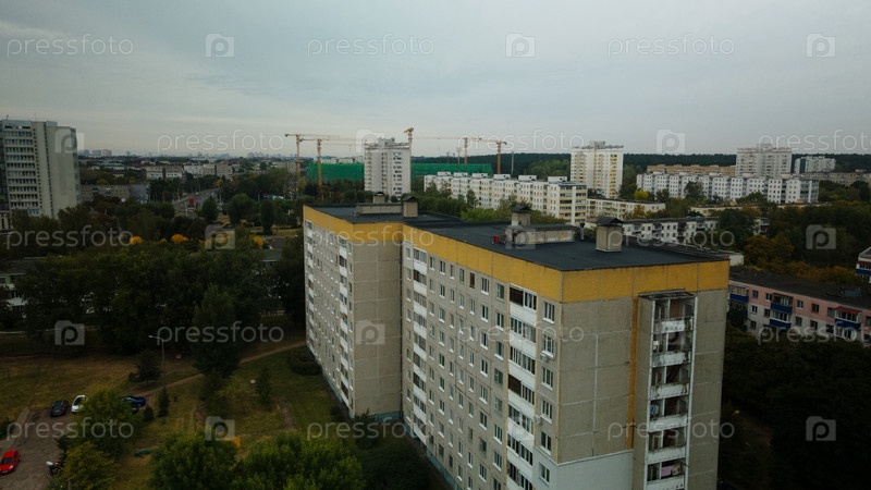 Многоэтажные дома с инфраструктурой. Густонаселенная городская территория. Пасмурная погода. Аэрофотосъемка