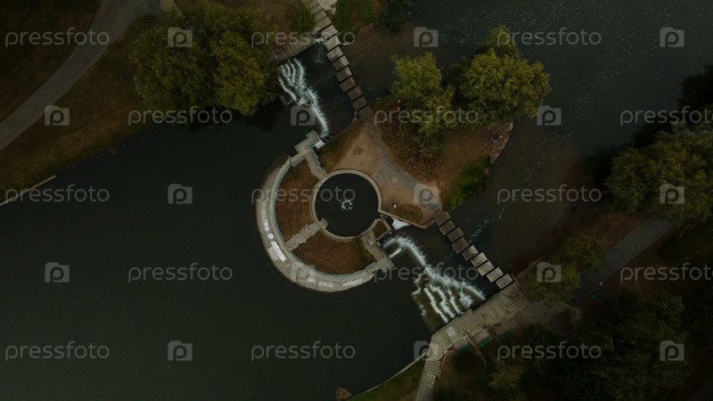 Река в городском парке. Многоэтажные дома с инфраструктурой. Густонаселенная городская территория. Пасмурная погода. Аэрофотосъемка